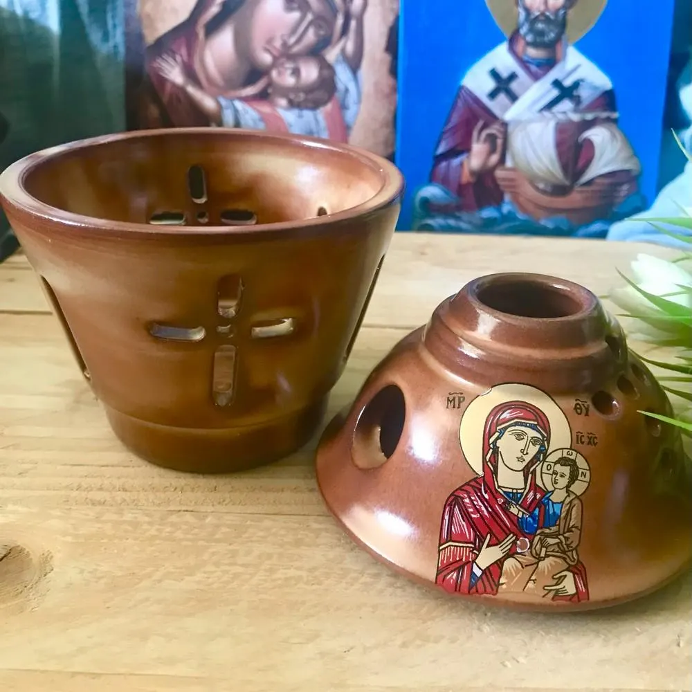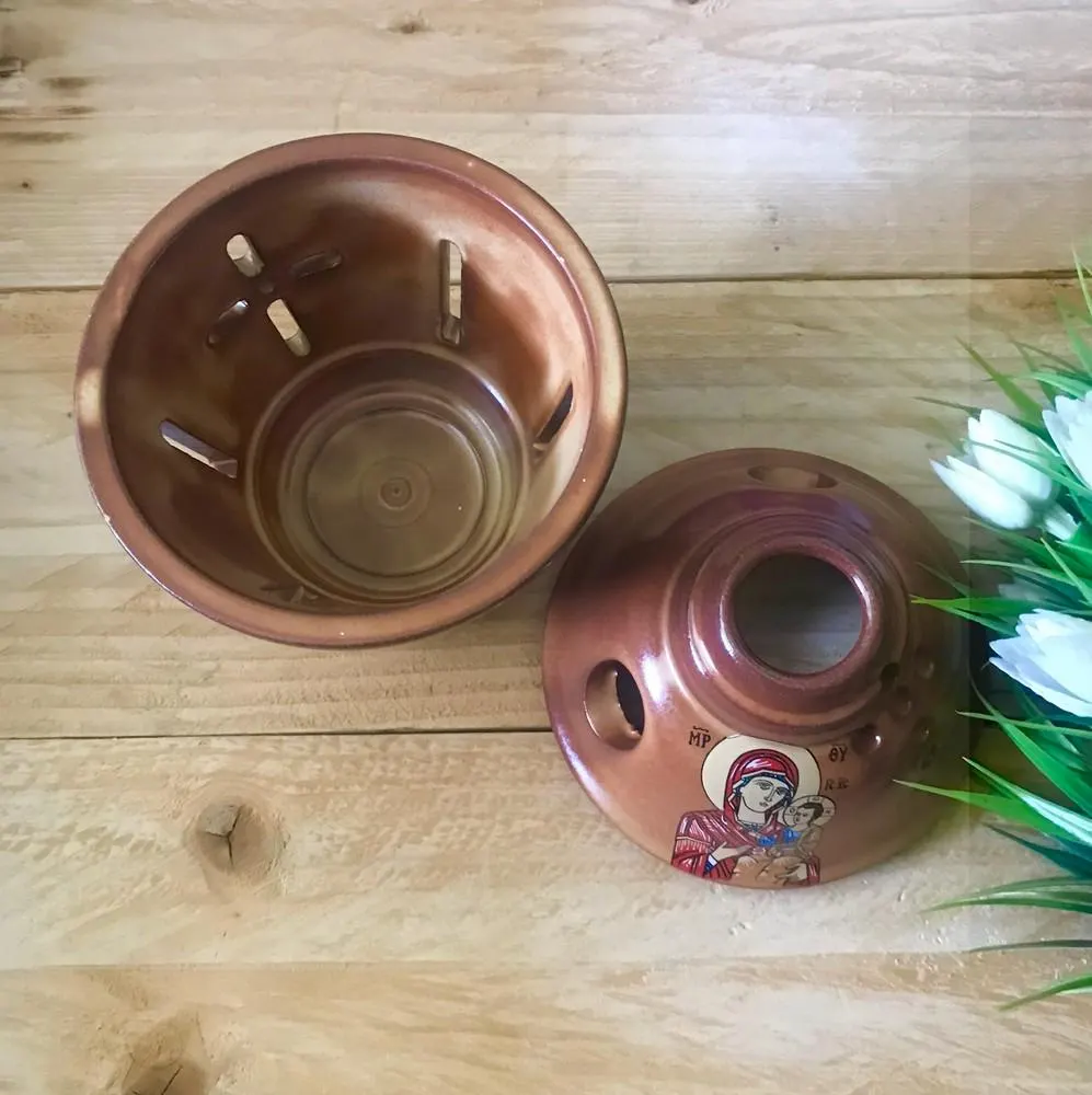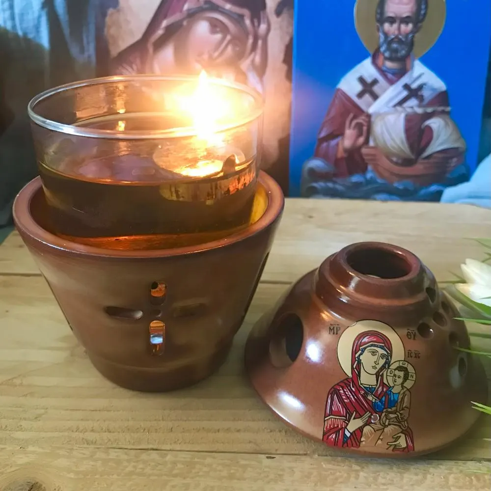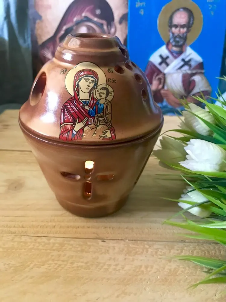 Enhance your prayer corner with this beautifully handcrafted Greek Orthodox ceramic vigil lamp, featuring a detailed icon of the Virgin Mary (Theotokos). This religious oil lamp is ideal for Orthodox Christian homes, serving both as a devotional item and a piece of spiritual decor.