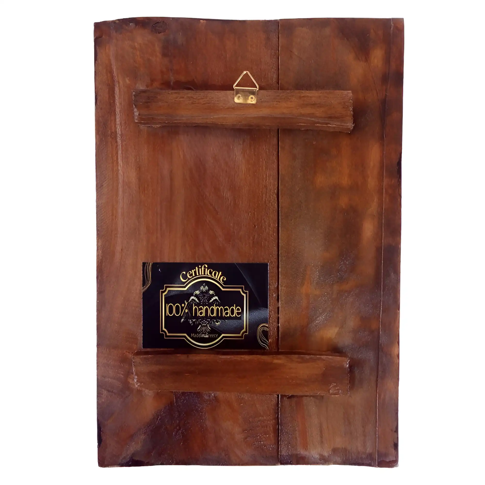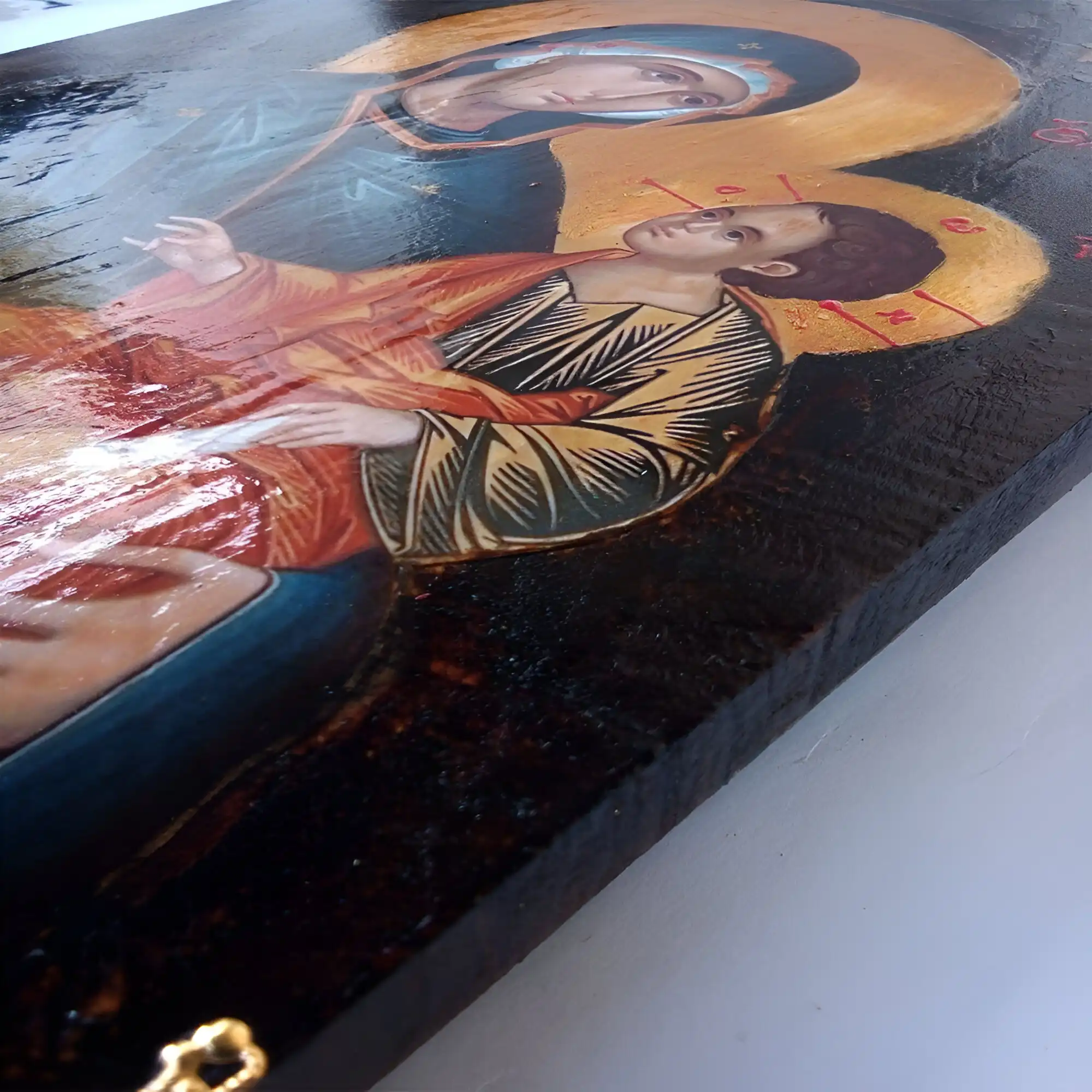 This Virgin Mary icon is a lovingly crafted piece of art made from natural wood, adorned with acrylic paint, and protected with varnish.