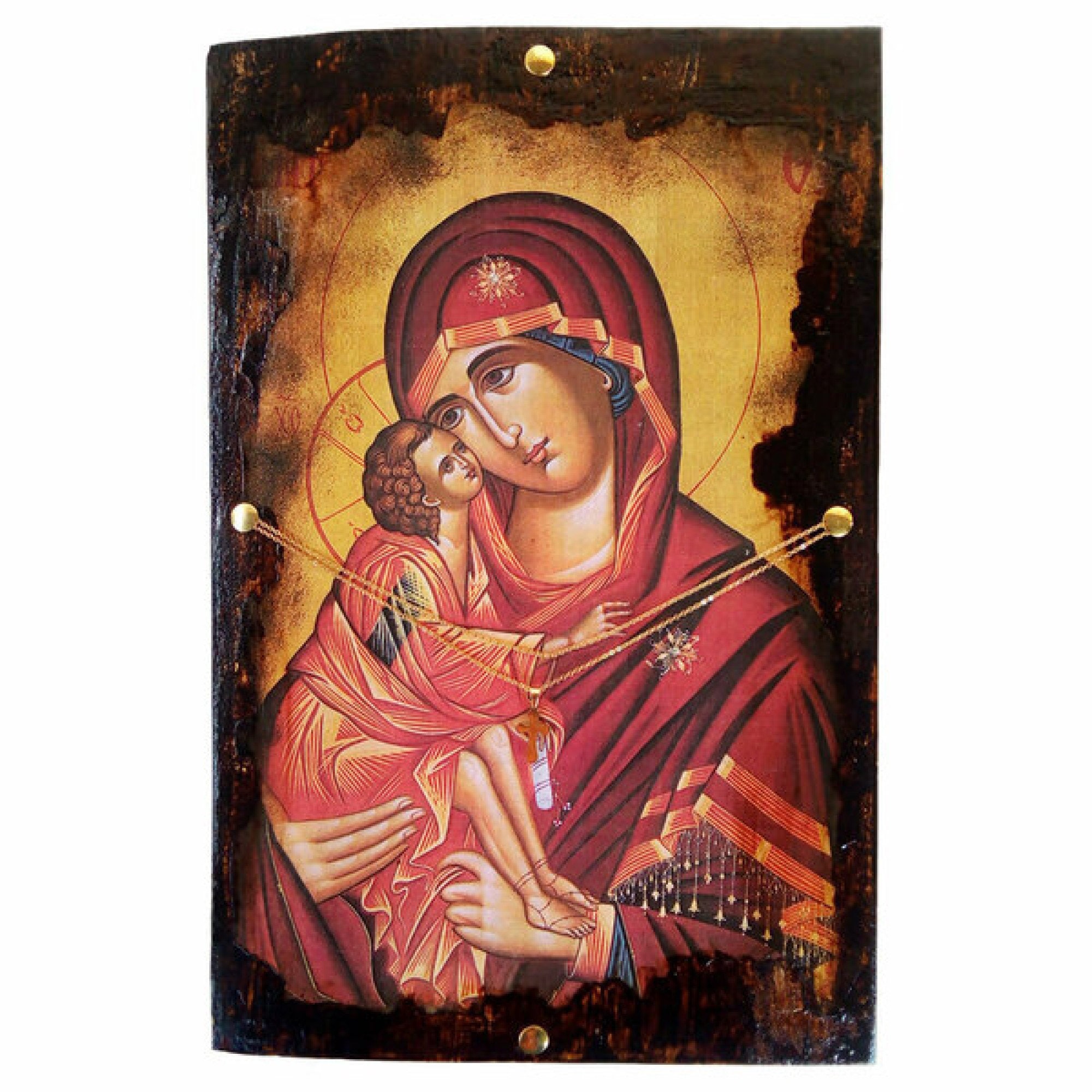 This handmade Virgin Mary icon is a beautiful piece of art crafted from natural wood and adorned with acrylic paint and varnish. The gentle and loving image of the Virgin Mary is depicted with care and devotion, radiating a sense of tranquility. To add a touch of elegance, it features a delicate chain with a cross. This icon serves as both a religious symbol and a charming decorative piece, perfect for bringing serenity and grace to any space.