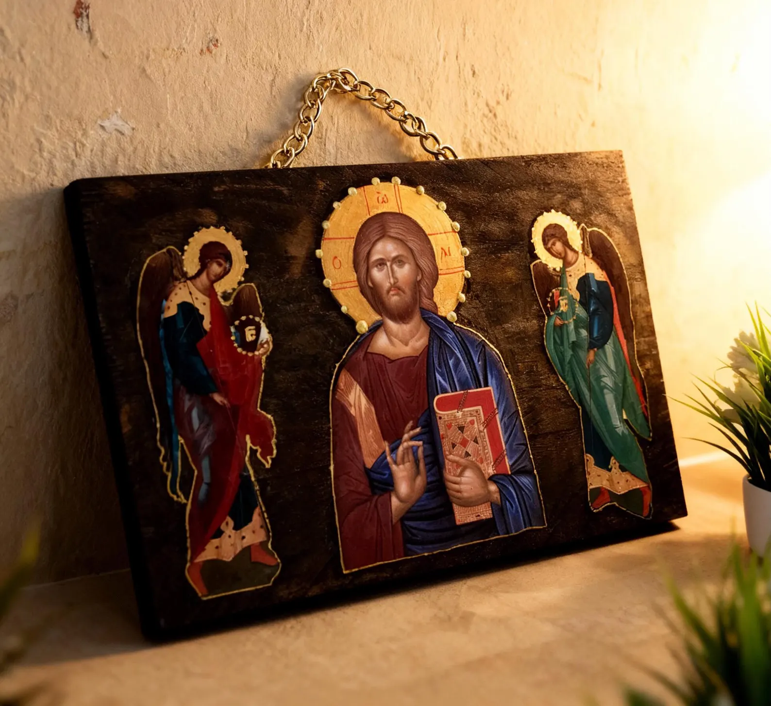 Αυτή η πανέμορφη χειροποίητη Ορθόδοξη εικόνα απεικονίζει τον Χριστό να ευλογεί, πλαισιωμένο από τους Αρχαγγέλους Μιχαήλ και Γαβριήλ. Κάθε εικόνα φιλοτεχνείται με προσοχή χρησιμοποιώντας παραδοσιακές μεθόδους, αποτελώντας μια μοναδική και γεμάτη νόημα προσθήκη για κάθε σπίτι ή πνευματικό χώρο. Είναι ιδανική για την προσωπική σας λατρεία ή ως ένα ξεχωριστό δώρο για τα αγαπημένα σας πρόσωπα.