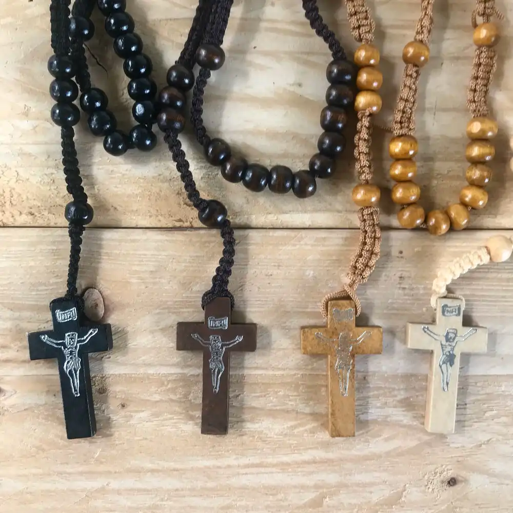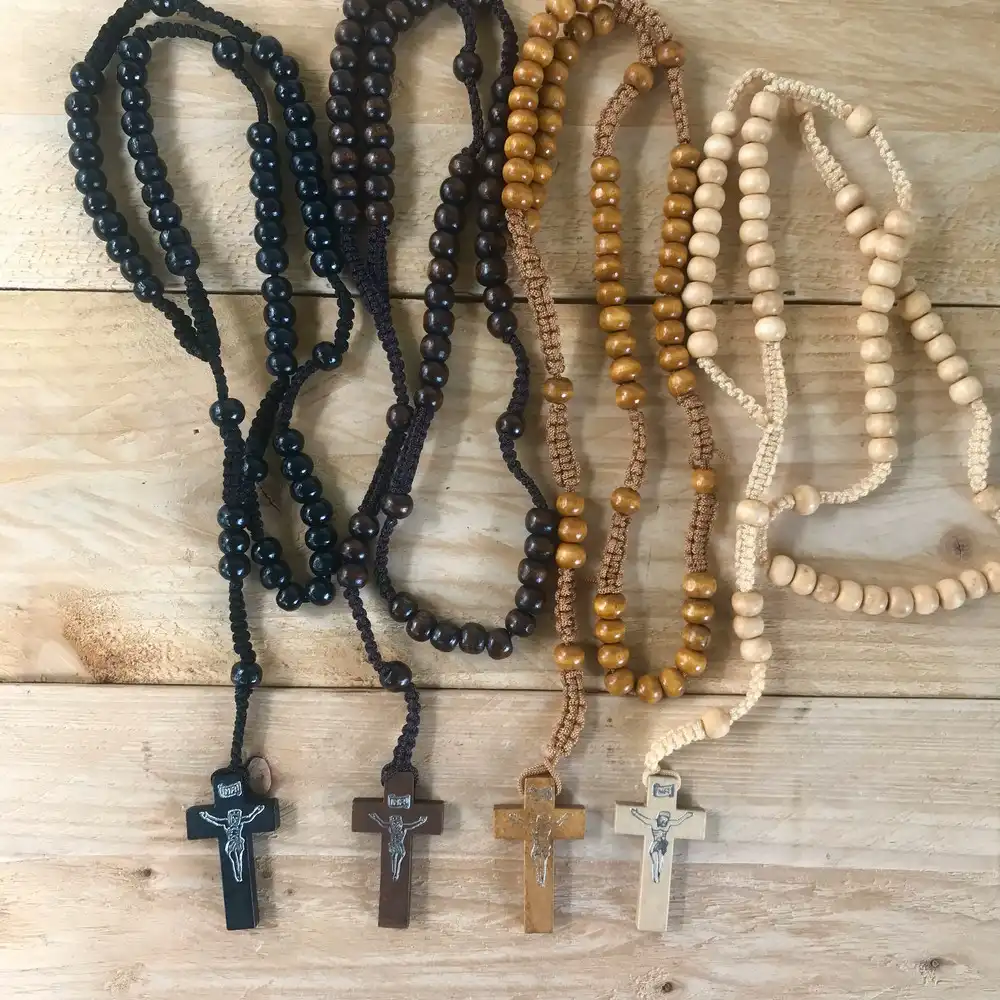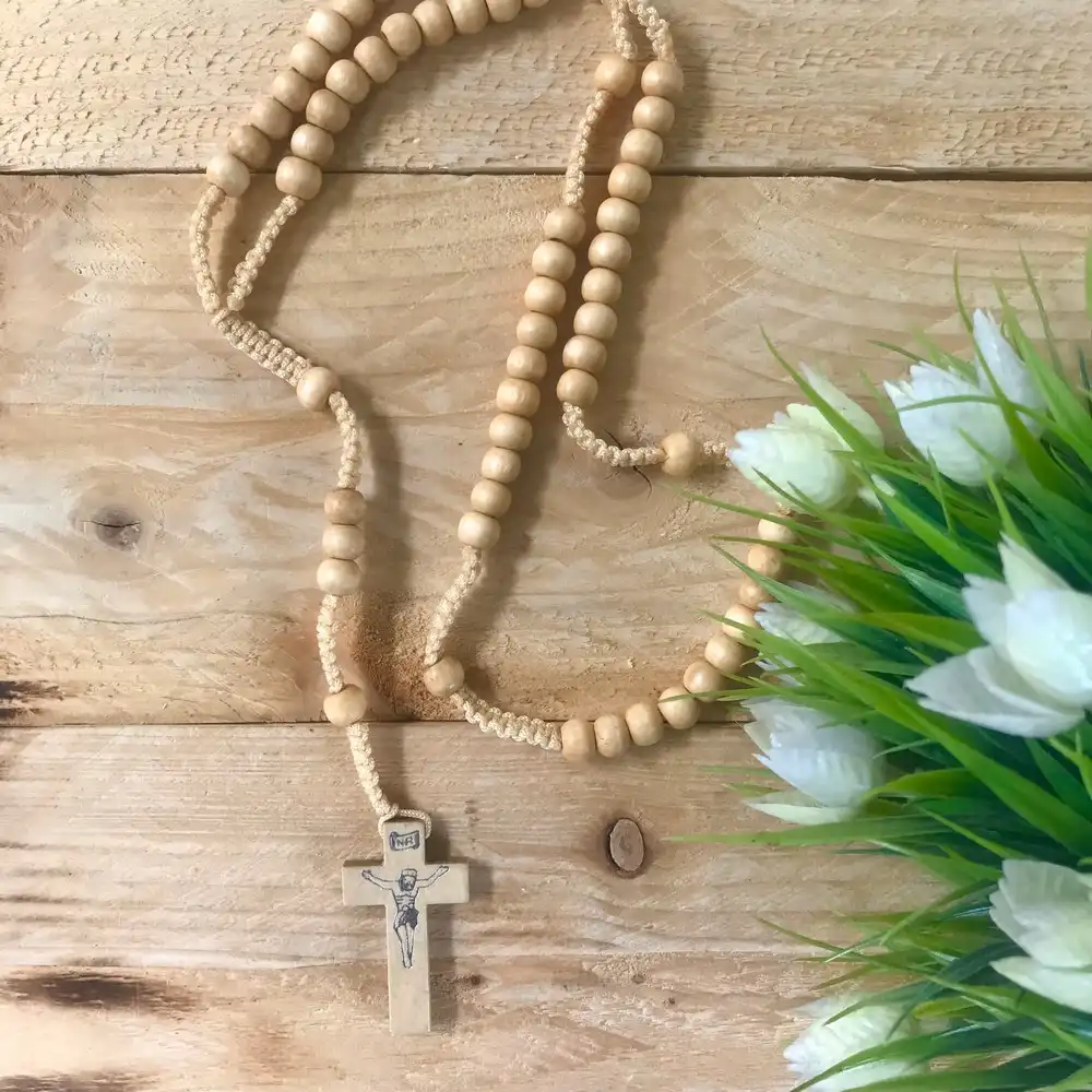 Carry a symbol of faith and tradition with this beautifully wooden cross necklace with wooden bead rosary. Carefully crafted using smooth, natural wood, this hanging rosary features a minimalist cross pendant and hand-strung wooden beads, making it both a spiritual and stylish accessory.