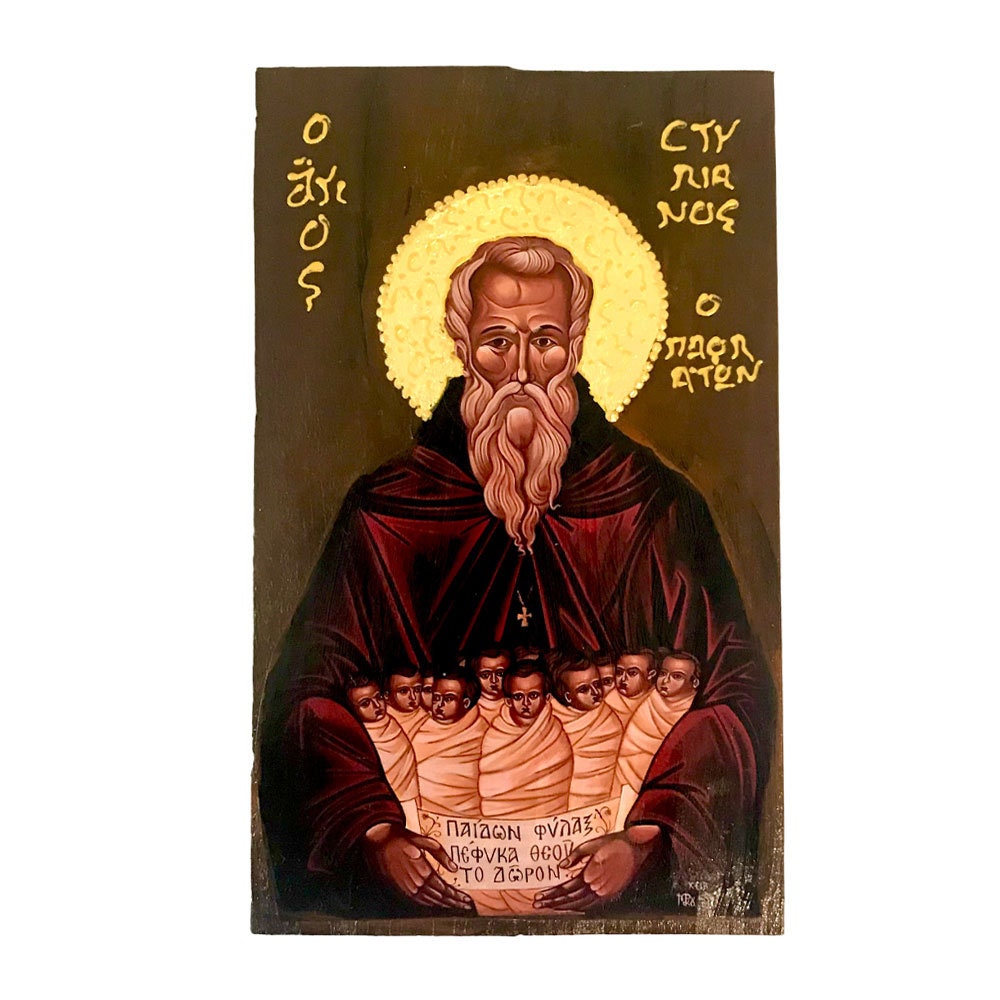 Handmade Orthodox icon of Saint Stylianos, protector of children. A unique wooden icon for blessings, baptism gifts, or Christian home decor.