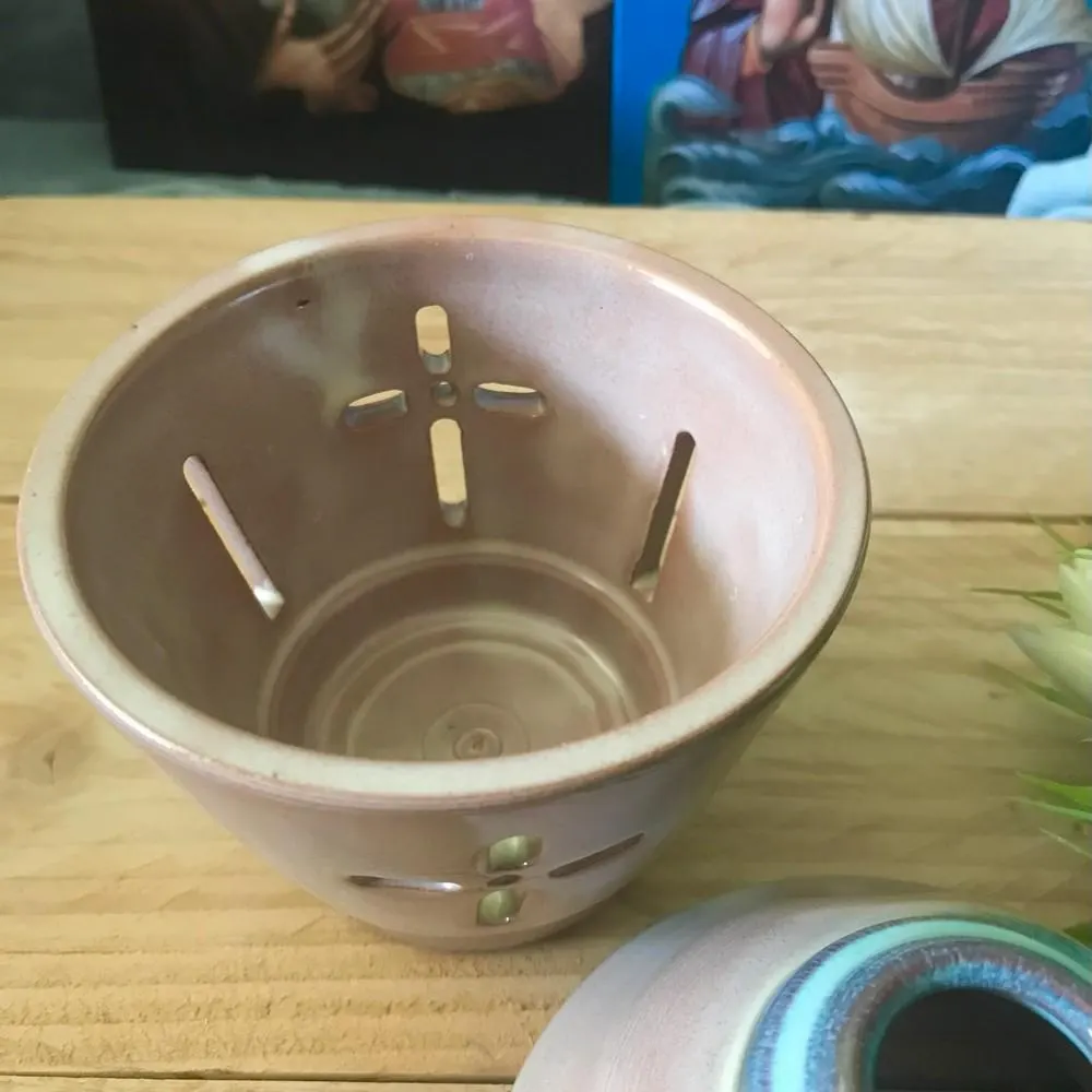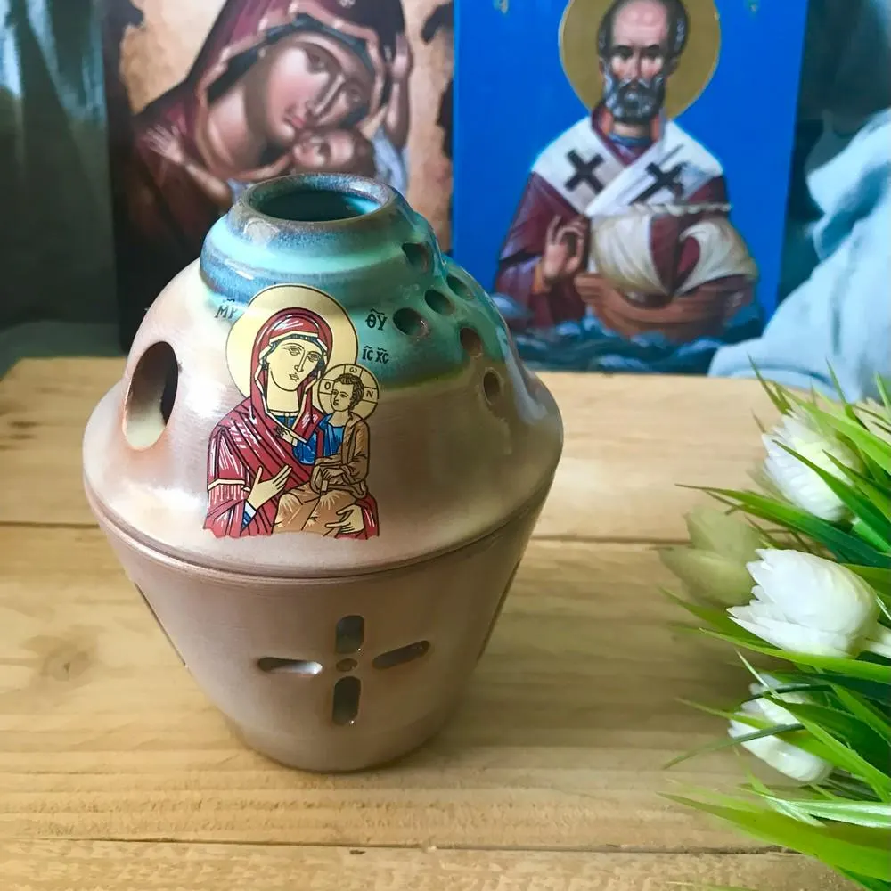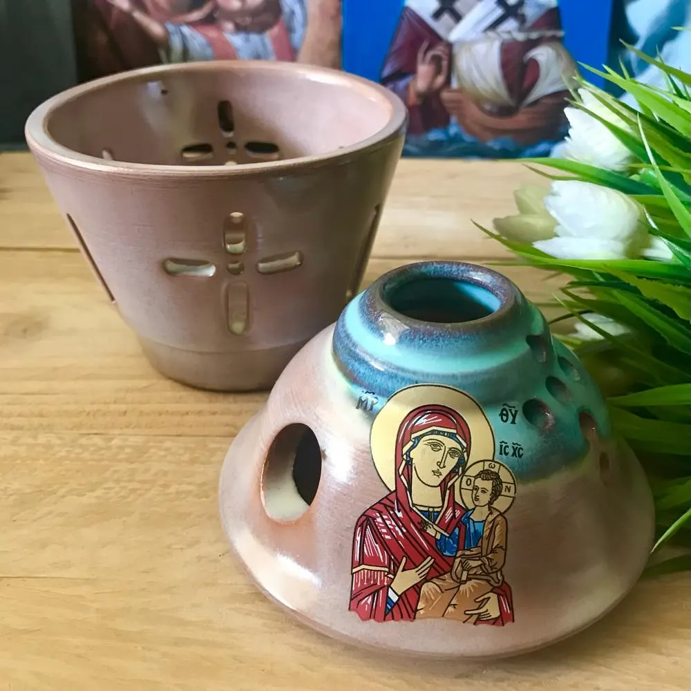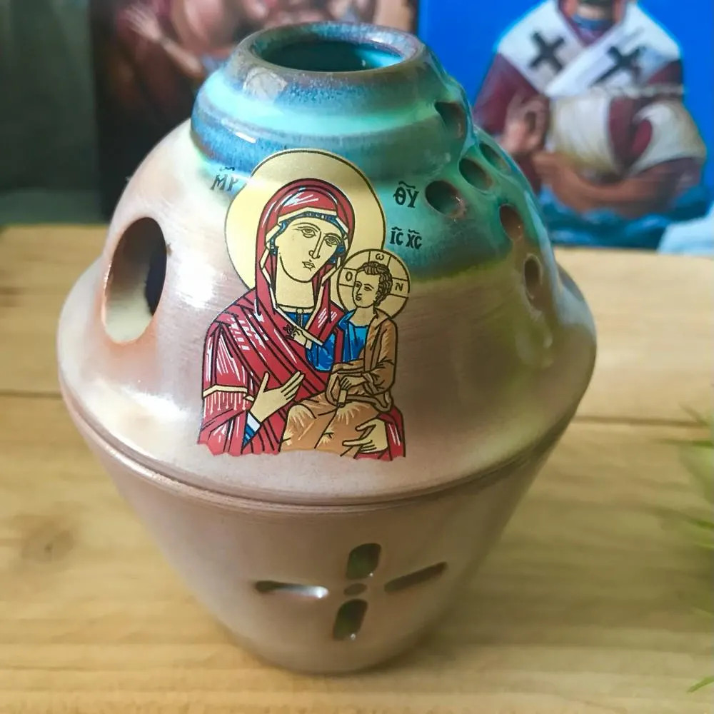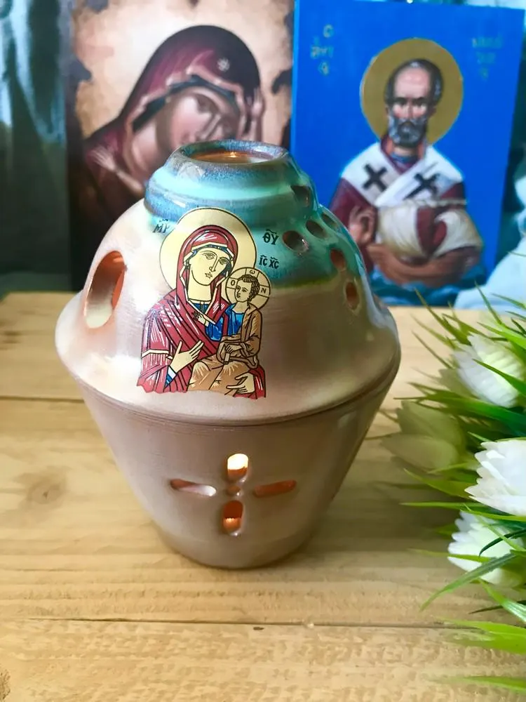 Enhance your prayer corner with this beautifully handcrafted Greek Orthodox ceramic vigil lamp, featuring a detailed icon of the Virgin Mary (Theotokos). This religious oil lamp is ideal for Orthodox Christian homes, serving both as a devotional item and a piece of spiritual decor.
