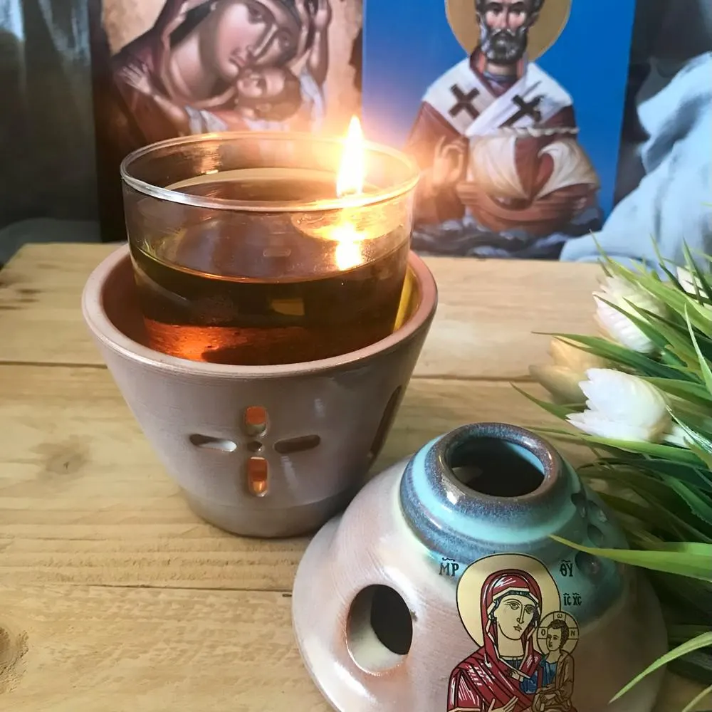 Ceramic Greek Orthodox Vigil Lamp with Icon of the Virgin Mary – Theotokos Oil Lamp – Orthodox Home Decor