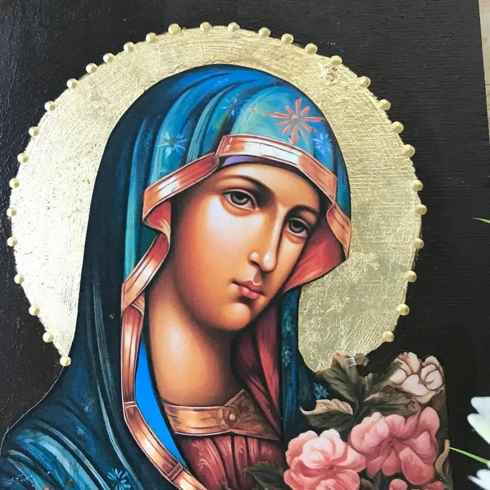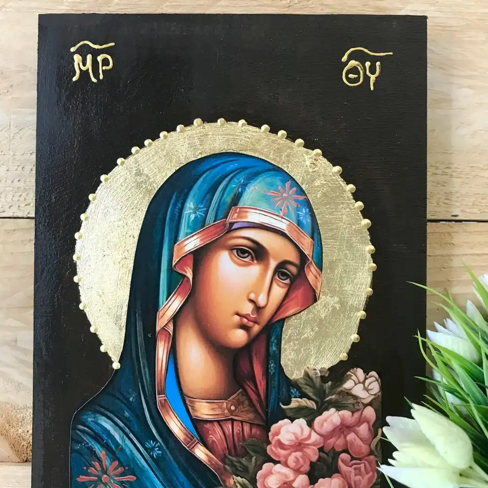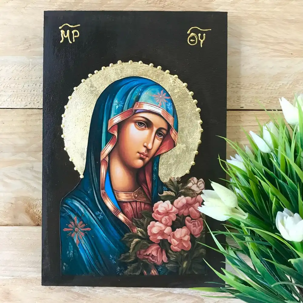 Handmade Virgin Mary Icon with Flowers | Blue Robe & Gold Leaf Halo | Wooden Orthodox Icon | Christian Religious Gift