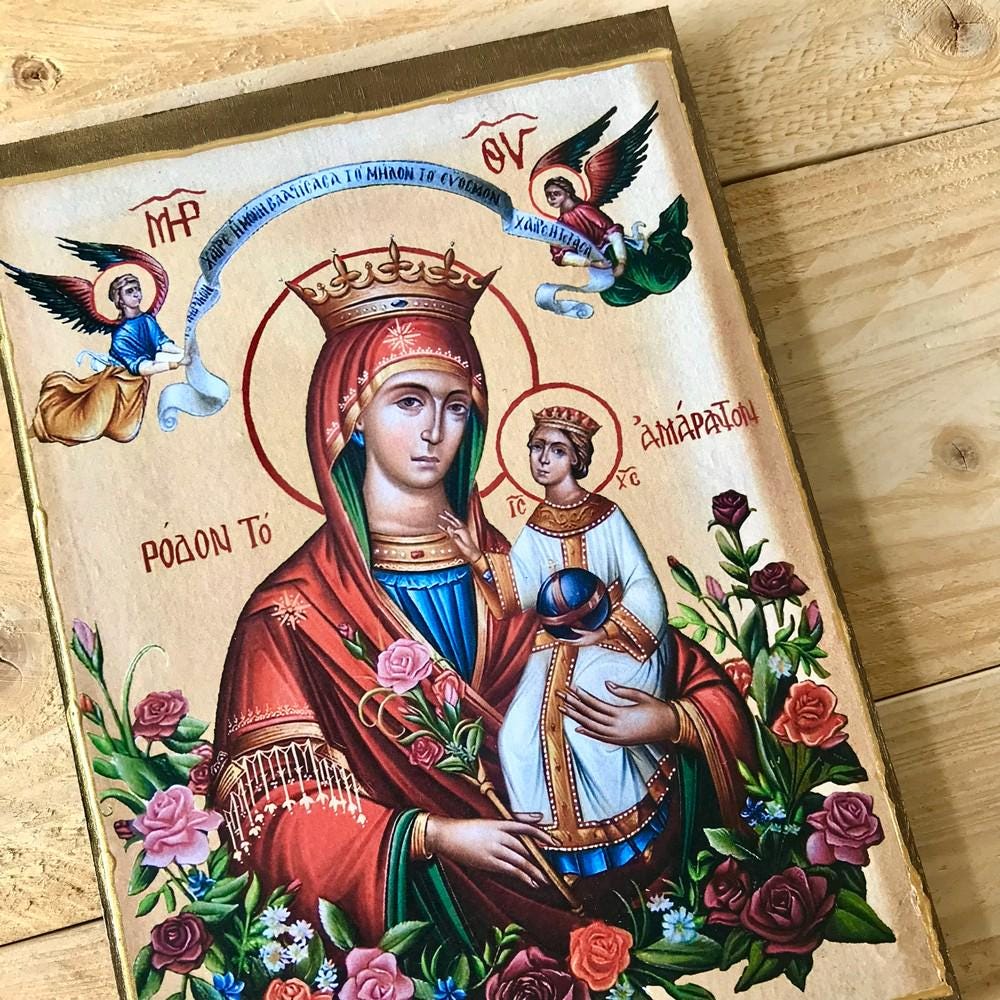 The handmade icon “Virgin Mary Rose of the Everlasting” captures the profound spirituality and eternal beauty of the Virgin Mary, symbolizing the eternity and incorruptibility of the soul. The “Rose of the Everlasting,” also known as the “Rose of the Virgin” or the “Rose of Jericho,” is the flower closely linked to Divine Salvation and the pure nature of the Virgin Mary. This icon portrays the Theotokos as the flower that never wilts, remaining pure and immaculate despite the surrounding world of sin. Both Christ and the Virgin Mary embody the “Rose of the Everlasting,” representing the eternal fragrance of their presence and their unchanging holiness.