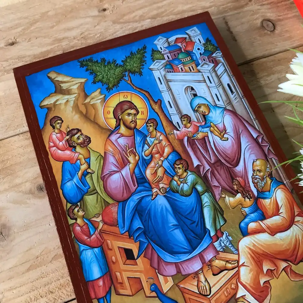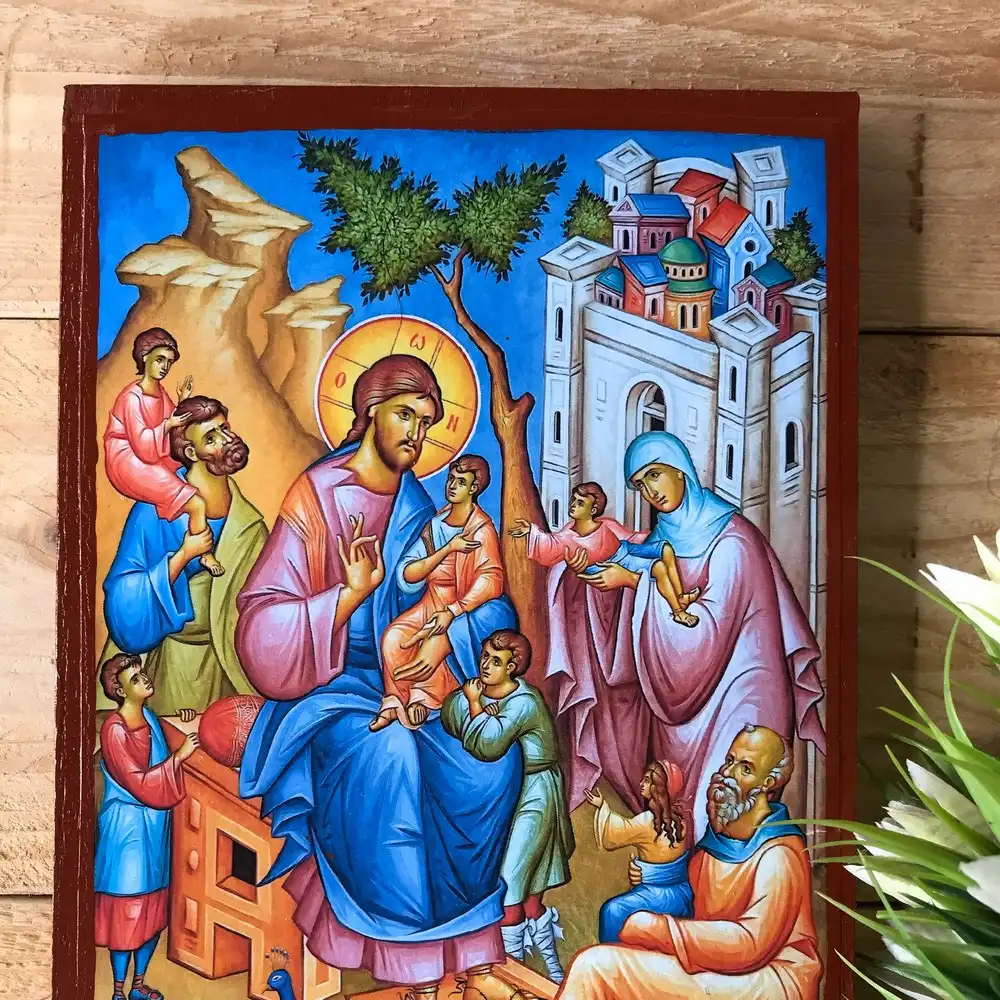Handmade wooden icon of Jesus Christ Blessing the Children. Created in the traditional Orthodox Christian iconography style, this piece offers spiritual comfort and makes a perfect religious gift for baptisms, children’s rooms, and Christian home décor.