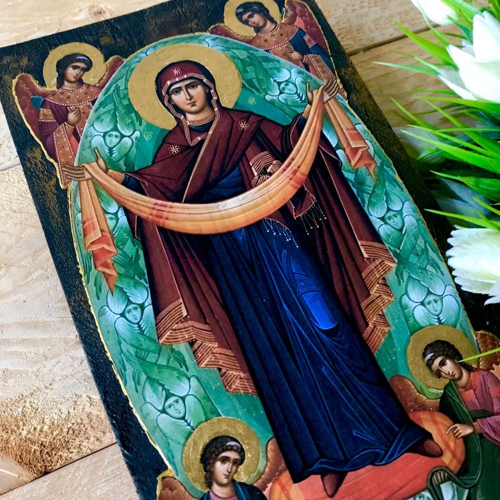 The depiction of the Holy Protection, one of the most beloved among Orthodox Christians, portrays the Virgin Mary protecting with Her mantle those who invoke Her. The icon is painted with vibrant colors and fine lines, creating a sense of holiness and devotion.