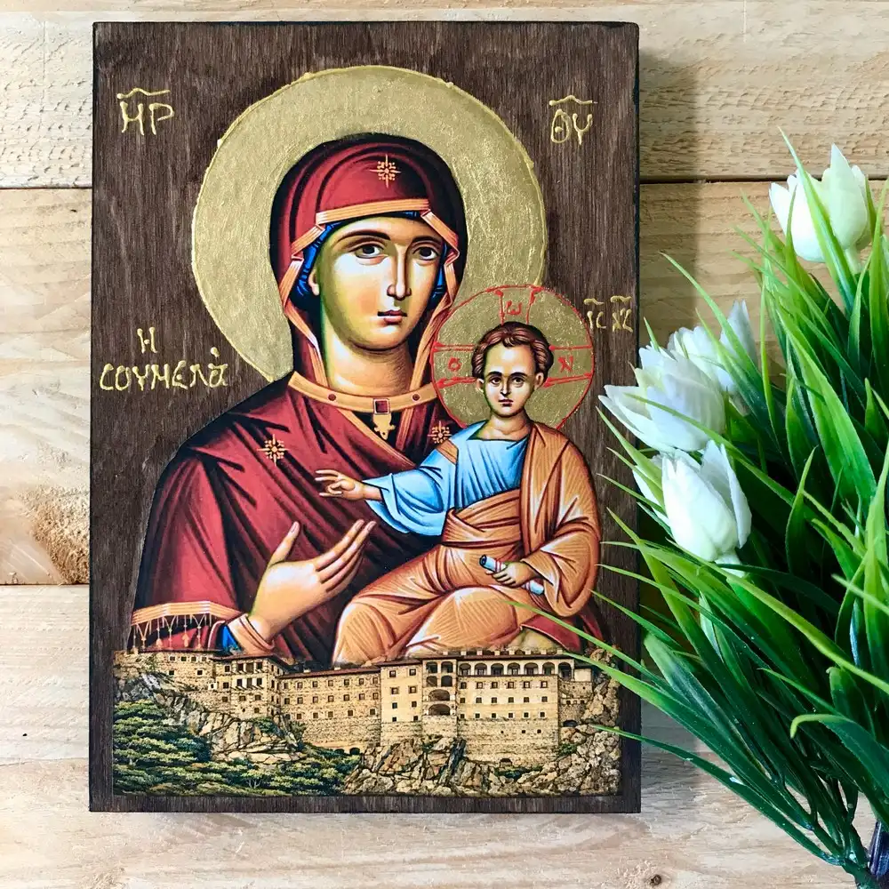 According to tradition, the icon is one of the works of Luke the Evangelist. It depicts the Virgin Mary and was originally known as “Athiniotissa.” In 386 AD, following a vision, two Athenian monks, Barnabas and Sophronios, carried the icon to the steep cliffs of Mount Mela in Trebizond (modern-day Turkey).