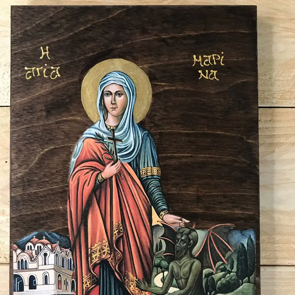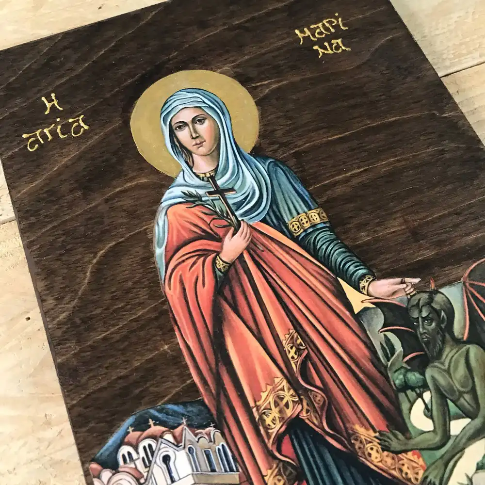 Saint Marina the Great Martyr Handmade Wooden Greek Orthodox Icon, Christian Art